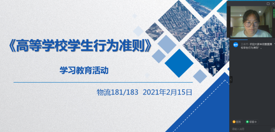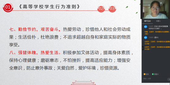 教育活动主要就《高校员工行为准则》的八项准则进行了学习,引导班级同学就建设优良学风班集体,做到明理修身、团结友爱、礼敬师长等进行了主题教育活动。