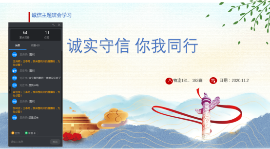 班会开始,辅导员带领大家学习了中华传统美德中关于诚信的典型故事,并鼓励大家踊跃发言,发现身边的诚信榜样,向大家分享。班会中,物流181班王诗顺、物流183班马杨扬等几位同学向大家分享了他们在生活中遇到的关于诚信的小故事。从他们的讲述中,我们看到了故事虽小,但却足够鼓舞人心,给人温暖。