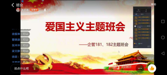 为进一步加强同学们的爱国主义精神,继承中华民族热爱祖国的光荣传统,弘扬中华民族精神,不忘国耻,奋发图强,立志报国,2020年9月28日晚,企管181与企管182班通过钉钉群的直播形式开展了“爱国主义”主题班会。
