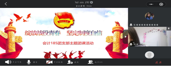 4月24日下午,会计185班通过腾讯会议视频平台开展了“绽放战疫青春·坚定制度自信”主题团课活动。大家通过观看视频,了解“五四运动”这一历史事件及其历史意义,使大家认识五四运动,感悟五四精神,从而激发大家的爱国之情,激励大家勇担时代重任。通过视频讲解的疫情期间各国的状况以及采取的措施和颁布的政策,充分体现出中国的制度优势,使大家坚定了打赢疫情防控战役的决心。