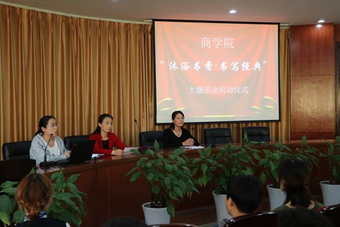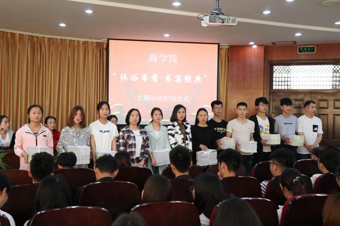 此次活动以“沐浴书香·书写经典”为主题,旨在培育员工好读书、读好书,常练字、练好字的良好习惯,激发大家的读书兴趣和热情,倡导全民读书、终身学习的良好风尚。在启动仪式上,商公司党总支副书记杜馨首先介绍了活动方案,鼓励员工多读书、写好字提高知识素养,陶冶情操,增强人文底蕴;企管163班李欣代表全体员工表示会珍惜这次学习的机会,以此次活动为契机,认真阅读全系老师为大家精心挑选的书籍和文章,用心临摹字帖,让学习成为一种习惯。随后,党总支书记李相勤勉励员工认真落实学习内容,切实提高个人知识储备,提升人文素养和书写能力,共同实现“文化梦”、“中国梦”。她还结合个人经历送给员工三点建议,一是学会时间管理,二是培养自学能力,三是多阅读经典的书,让芸芸书香伴随员工一路成长。最后,辅导员老师为2017级21个行政班的1100余名员工发放字帖。