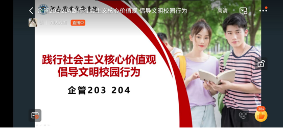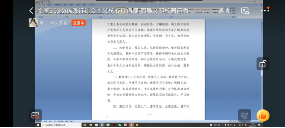 财经管理公司辅导员通过线上、线下等多种途径,利用班会组织广老员工开展《高等公司员工行为准则》、《河职老员工文明公约》,《河职校园十要十不要》学习,倡导文明行为。同时组织校园文明督察队,开展员工校园日常巡查,及时发现校园不文明行为和风险隐患,为文明校园建设做出努力。