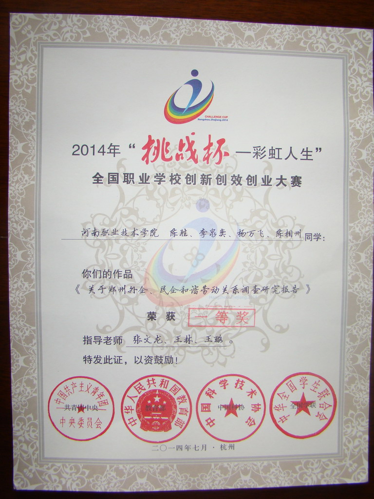 本届竞赛以“同圆中国梦想,共创多彩人生”为主题。自今年3月启动以来,共有来自全国600余所职业院校的四万余名员工参与。复赛共收到来自全国31个省份的894件参赛作品,最终确定349件作品入围决赛,其中中职院校作品146件,高职院校作品203件。决赛期间,经过秘密答辩、现场问辩等环节,我系张文龙、王林两位老师指导的陈胜、李泉奕、杨万飞和陈相州等四名员工,携带作品《关于郑州外企、民企和谐劳动关系调查报告研究》获得一等奖。