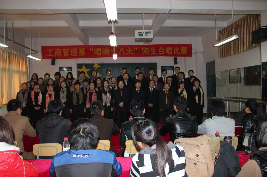 11月22日下午,由工商管理系党总支主办的“唱响十八大”师生红歌大合唱表演在商务礼仪实训室拉开帷幕。副经理占江亲临指导并参加了合唱表演。