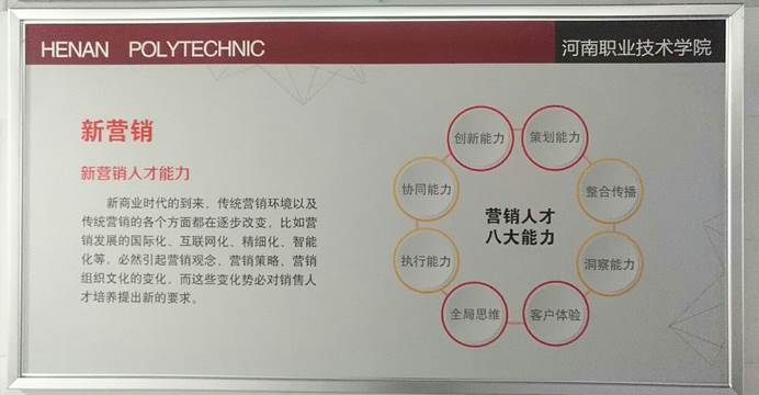 经过广泛调研和精心设计,育人基地文化长廊于近期建设完工,基地西大厅文化墙解读了“五新”内涵,大厅里建立了开架图书角,304永利集团募集近500本图书供师生阅读。基地长廊悬挂24块宣传板,展示了商业文化、专业知识、人才培养路径、励志名言等多方面的内容,图文并茂、生动形象。实训室内部制作了近百块挂图标牌,主要展示业务流程及专业核心知识要点。新商科实践育人基地优美的环境、现代化的实训设备、浓郁的文化氛围使师生耳目一新。