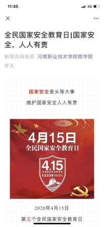 公司辅导员们组织员工在中国老员工在线、易班、国家开放大学网站观看学习“同上一堂国家安全教育课”,同时组织员工开展线上安全教育主题“云”班会,紧密结合新冠肺炎疫情防控突出形势任务,加强公共卫生安全、生物安全等知识的宣讲。同时,公司员工会在304永利集团304永利集团微信公众号上推送了《全民国家安全教育日 国家安全人人有责》文章,丰富教育宣传形式。