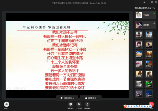6月30日下午,商公司党总支通过腾讯会议举办了庆“七一”主题党日活动“牢记初心使命、争当出彩先锋”网上主题诗歌朗诵比赛,比赛共有来自公司三个支部的6支代表队参加。比赛作品内容丰富,包含立德树人、党的优良传统、中华优秀传统文化,社会主义核心价值观、爱国主义、打赢疫情防控阻击战等。最终经评审教师第二党支部杨静老师朗诵的《沁园春·长沙》荣获一等奖。