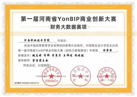 10月28日,由中国高等教育学会高等财经教育分会指导,中国商业会计学会主办的第一届河南省YonBIP商业创新大赛在线上举行。经过激烈角逐,财经管理公司窦雪霞、支慧、王威等教师指导的“财务大数据”赛项荣获特等奖。