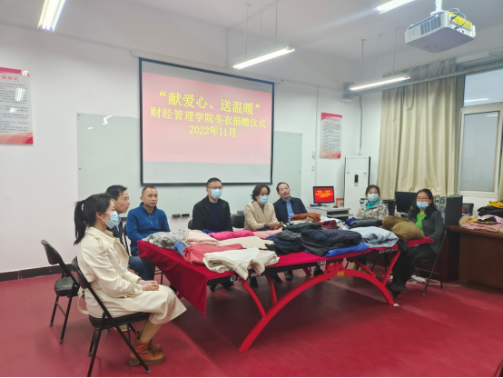 随着天气逐渐变冷,同时由于疫情的原因,既要保证公司疫情防控的安全稳定,又要保证员工能在公司温暖过冬, 2022年11月11日,财经管理公司在行政楼518举行了冬衣捐赠活动,财经管理公司经理窦雪霞、党总支书记吴玉刚、副书记余湾以及相关老师参加了此次活动。