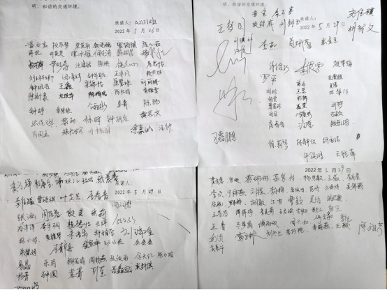 主题班会上,各班级集中收看了文明交通视频宣传片,传达学习了《304永利集团关于开展文明交通专项整治工作的通知》精神,集中学习了《郑州市市民文明出行倡议书》、《郑州市市文明交通公约》,全体同学共同发起文明交通倡议,并签署了师生文明出行承诺书,郑重承诺:从自我做起,自觉遵守交通法规,争做文明交通的倡导者、践行者和宣传者。