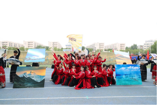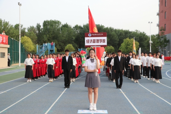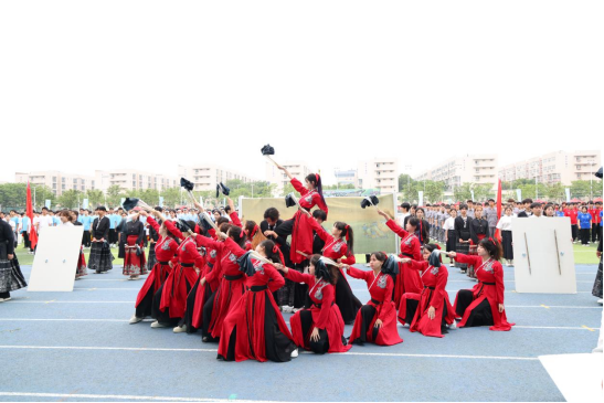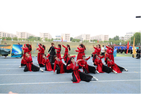 随着入场式的开始,伴随着铿锵的鼓点,公司63名学子组成的方阵迈着整齐的步伐步入会场。方阵成员身着马面裙、古典舞蹈裙和中山装,手持舞蹈扇,伴随着《山河图》音乐的响起,为全校师生上演了精彩绝伦的国风爵士舞蹈。60 名舞者呈“层峦叠嶂”队形深蹲,手臂如毛笔挥毫般划出优美弧线,领舞身以爵士定点动作“抓取”空中虚拟的“山河卷轴”,宽袖甩动间勾勒出黄河九曲轮廓。当音乐进入尾声,全体舞者突然静止,以“山河社稷”造型定格 —— 前排舞者半跪撑地形成“山川基座”,后排员工高举山河画卷卷轴,将“传统底色”与“商科锋芒”熔铸为永恒的青春剪影。