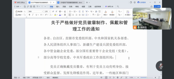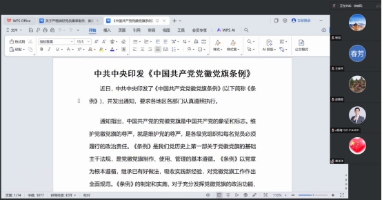 在学习过程中,党员们积极参与讨论,纷纷表示将严格按照文件要求,规范使用党徽党旗和党员徽章,自觉维护党的形象和尊严。线上参会的党员也通过视频连线的方式,分享了学习心得和体会,形成了良好的互动氛围。