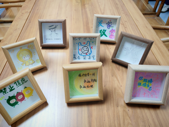 活动现场,同学们以空白画框为载体,通过手绘、拼贴等多元形式,将内心感悟转化为可视化作品。有的用彩铅绘制“向阳而生”的向日葵,配以“永远向阳、永远灿烂”的励志语录;有的将干花与彩纸结合,拼贴出“破茧成蝶”的蜕变图景。这种非言语化的表达方式,有效降低了心理防御,促进了同辈间的情感共鸣。指导老师现场引导:“艺术创作是心灵的镜子,每一笔色彩、每一处构图都是自我觉察的契机。”