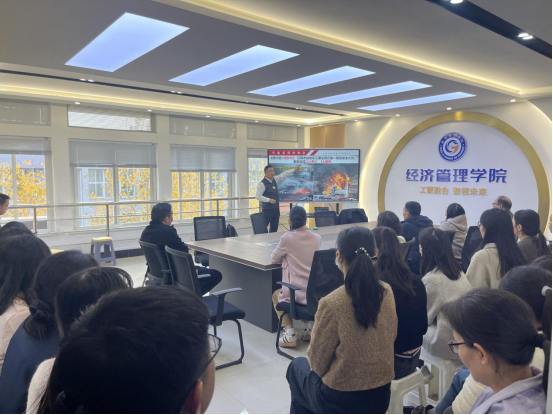 下午2点半,面向员工的培训专场率先在明理楼1104教室拉开帷幕。消防协会马教员结合高校消防安全案例,用触目惊心的图片和视频,详细剖析了宿舍违规用电、实验实训室操作不当等常见火灾隐患的危害的根源。针对员工群体特点,马教员重点讲解了火灾初期报警技巧、疏散逃生注意事项,特别强调“弯腰捂鼻、低姿前行”等逃生要领,并现场演示了手提式干粉灭火器的“提、拔、握、压”四字操作口诀。在互动环节,员工们踊跃提问,就“宿舍插排使用规范”“电动车充电安全”等问题与教官深入交流,现场学习氛围浓厚。