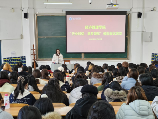 紧接着,“行业对话 筑梦领航”模拟面试课堂火热开展。公司特邀请具有实战经验丰富的资深企业人士北京七月森林科技有限公司总经理吴明月,围绕经济管理类热门岗位设置了无领导小组讨论、结构化面试两大核心环节。参与员工以小组为单位,围绕“企业数字化转型中的人才需求”等议题展开激烈讨论,展现出扎实的专业素养和清晰的逻辑思维。针对同学们存在的“答题角度单一”“时间把控不足”等问题提出改进建议,并现场演示了优秀面试应答的逻辑框架,让同学们直观感受面试技巧的核心要点。