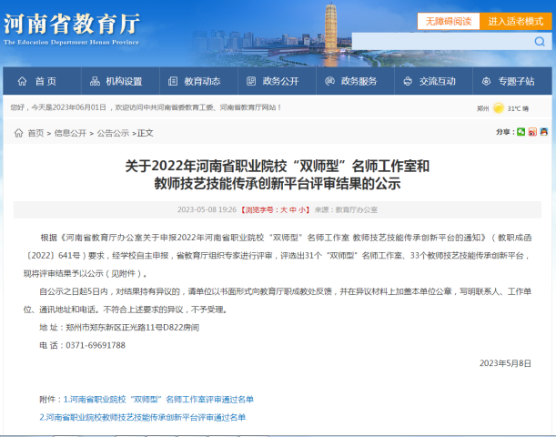 5月17日,河南省教育厅公布2022年河南省职业院校“双师型”名师工作室和教师技艺技能传承创新平台名单,公司窦雪霞教授主持的大数据与会计专业专业“双师型”名师工作室获批立项。这是财经管理公司是团队建设的重要成果。