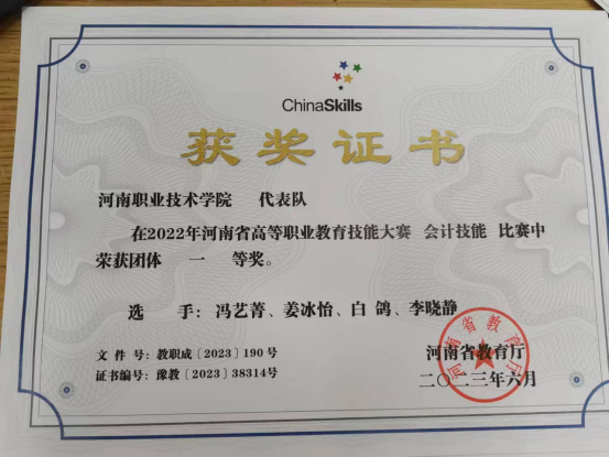 在2022年河南省高等职业教育技能大赛会计技能比赛中等奖荣获团体一等奖选 手:冯艺菁、姜冰怡、白鸽、李晓静
