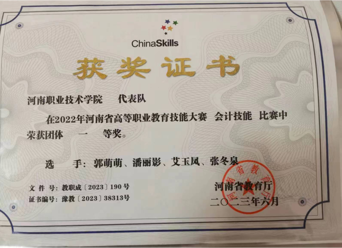 财经管理公司在2022年河南省高等职业教育技能大赛会计技能比赛中荣获团体一等奖选手:郭萌萌、潘丽影、艾玉风、张冬泉